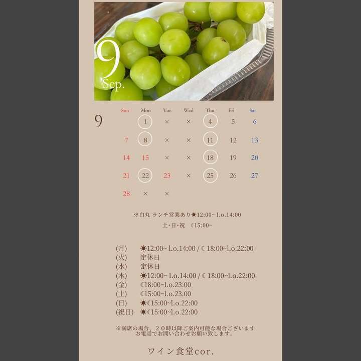 15(月)、23(火)は祝日のためディナー営業